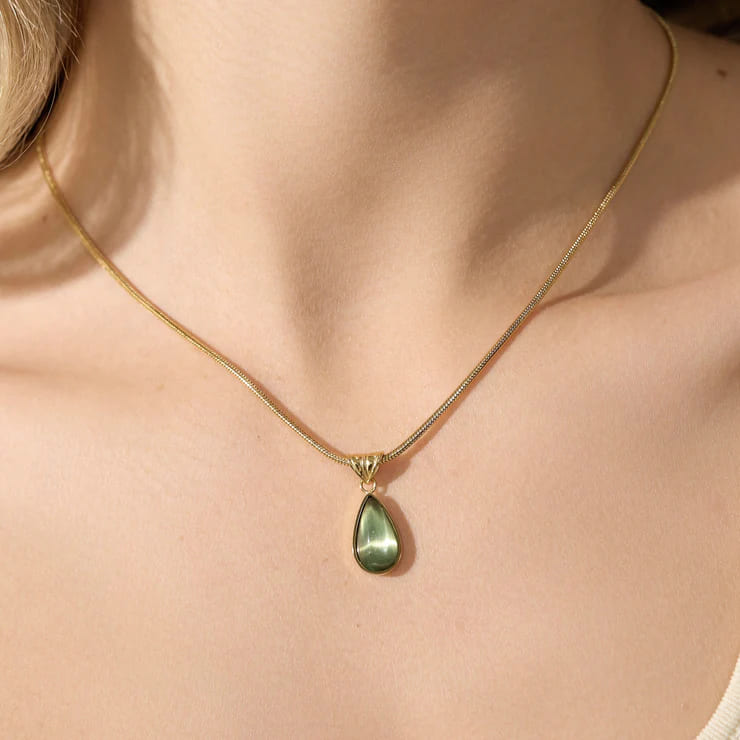 The olive green pendant brings a natural and sophisticated tone that pairs effortlessly with everyday outfits or special occasion wear. Its clean design makes it perfect for wearing alone or layering with other necklaces.