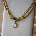 This gold-tone stainless steel bracelet features a layered chain design accented with natural stone beads and a minimalist circle charm.